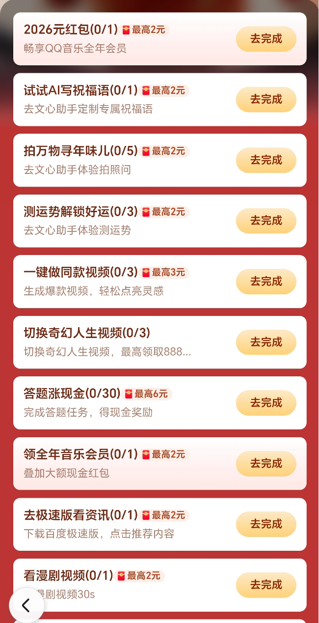 方式上,百度和腾讯发的是现金红包,领到红包后可提现,走的是传统红包逻辑。区别在于百度重任务,用户获得红包的主要方式是完成一系列任务,覆盖文心、百度极速版、好看视频、百度贴吧等一系列百度系产品。领取红包的“主阵地”在手百APP,从手百首页进入活动入口,到完成首次提现,我全程没有被引导下载文心APP。由此看来,百度发春节红包的内核更像是维持手百的DAU和留存,同时提升百度系产品的渗透。