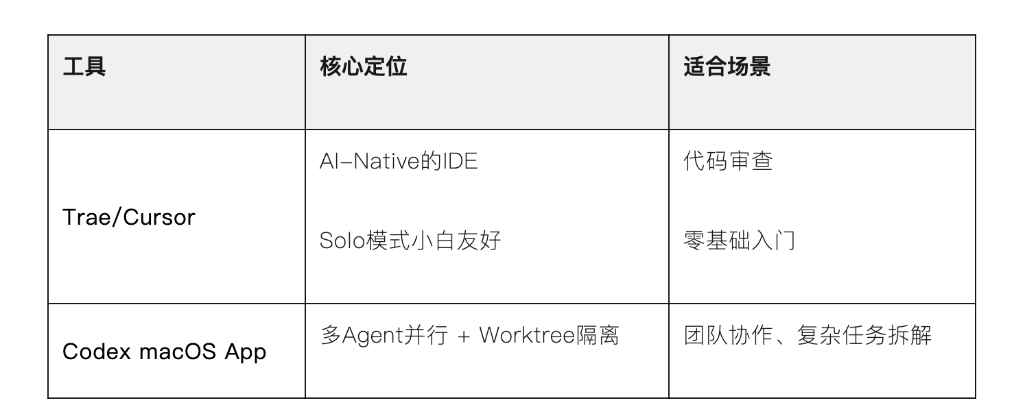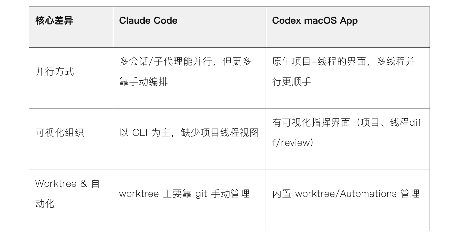 这是和Claude Code类的CLI产品对比,简单的说,没有可视化,多会话、子代理很麻烦,worktree也要自己来处理。