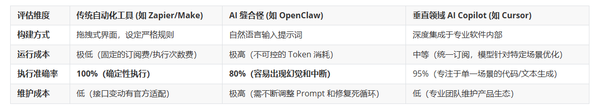 作为一款典型的“缝合怪”(Frankenstein)产品,OpenClaw 们陷入了深深的定位尴尬之中。我们可以通过一张简单的投入产出比(ROI)对比表来看清它的困境: