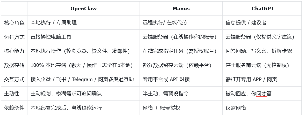 很多人第一次听说OpenClaw,会把它和ChatGPT、manus这类AI混为一谈。但真用上我才明白:传统AI是“顾问”,告诉你“怎么做”;manus是在线帮你做;OpenClaw是“本地助理”,直接帮你执行
