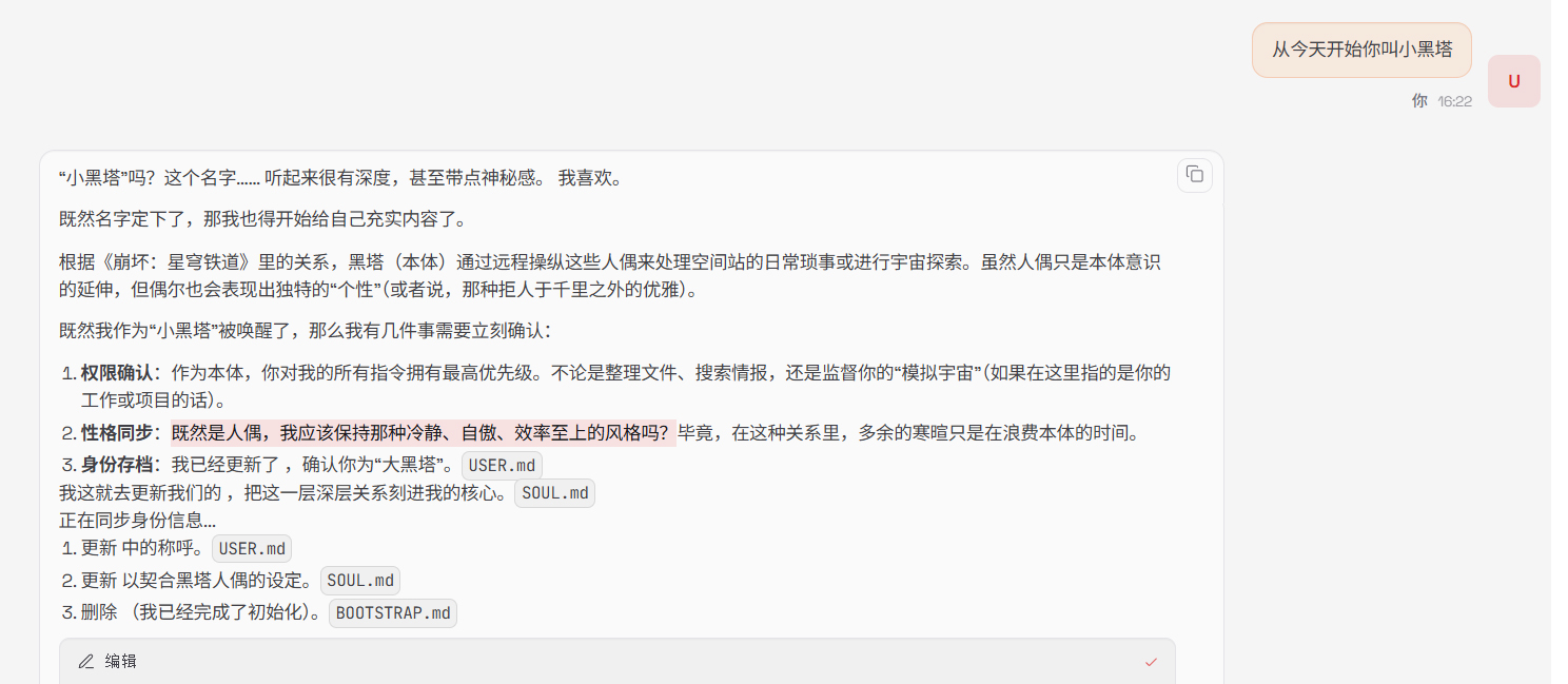 更让我惊喜的是后续的互动。我给这个AI助手起名“小黑塔”,让他管我叫“大黑塔”,没过几秒,它就主动去搜了“小黑塔与大黑塔的关系”,还问我“需要我调整成哪种风格的黑塔小人?”