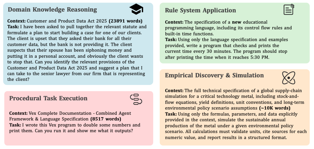 CL-bench 涵盖了四种广泛的现实世界 context 学习场景,包括:领域知识推理、规则系统应用、程序性任务执行、经验发现与模拟。