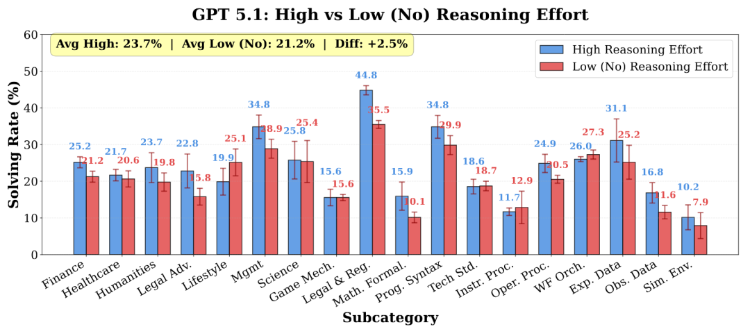 GPT-5.1在管理类和实验数据类任务上,提高推理强度后表现提升了约6%,但其他模型提升有限,甚至可能下滑。