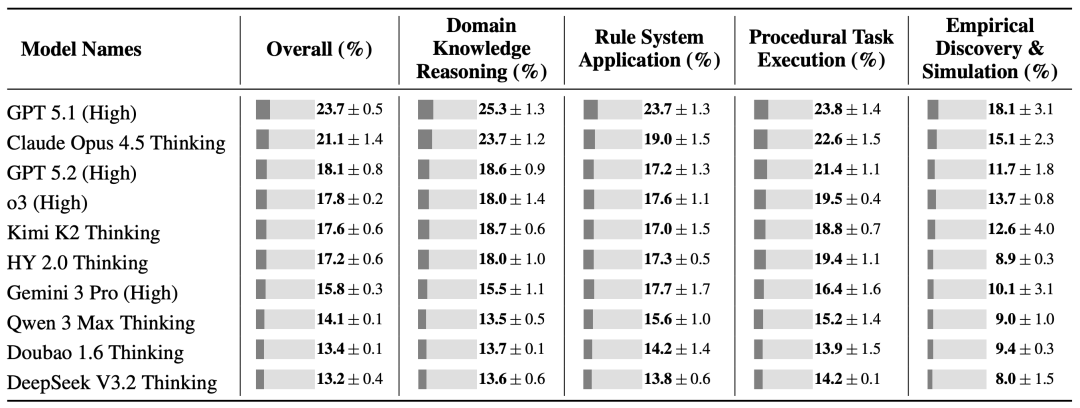 但这个低分,却是GPT、Claude、Gemini、Kimi、Qwen这些前沿模型中的最好成绩,这些模型平均分仅为17.2%。