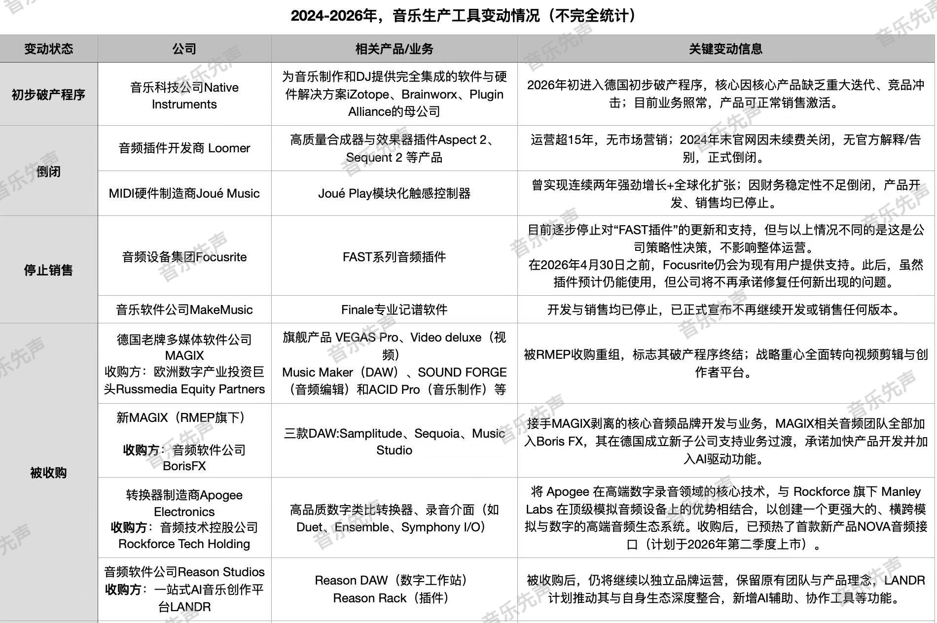 今年,转换器制造商Apogee Electronics、DAW品牌Reason Studios也先后被音频技术公司Rockforce Tech Holding、一站式AI音乐创作平台LANDR收购。