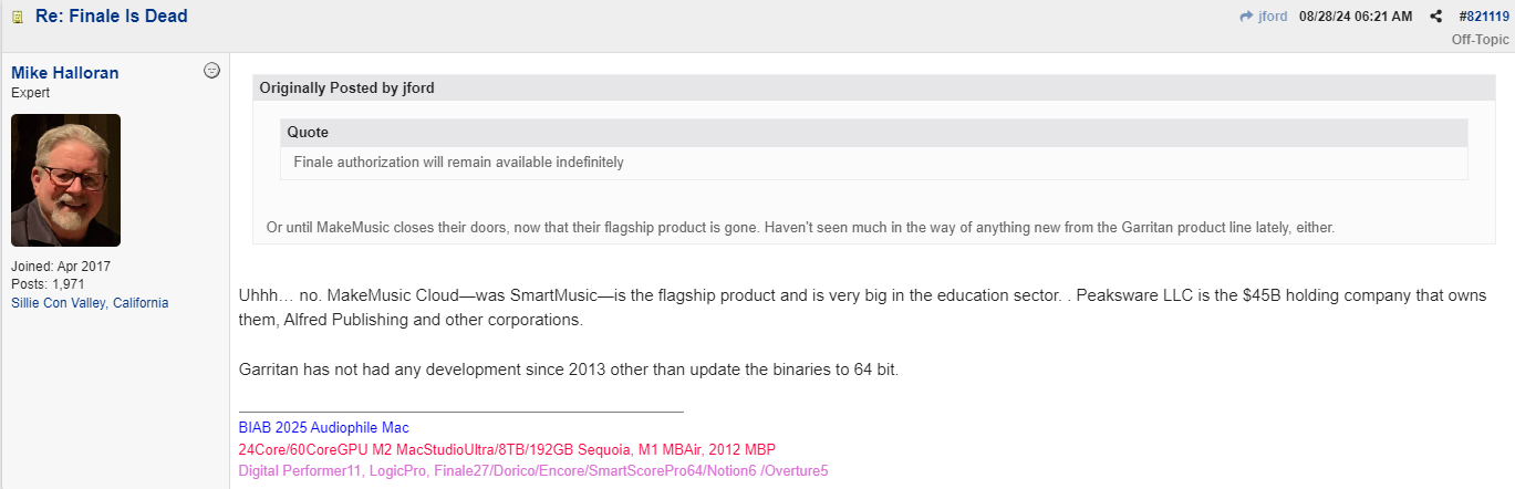 值得注意的是,MakeMusic旗下的音源库Garritan虽然未被正式停产,但目前也已处于边缘化的“维护模式”。不少用户指出,2013年来,Garritan产品线也没看到新东西,认为其后续更新希望渺茫。