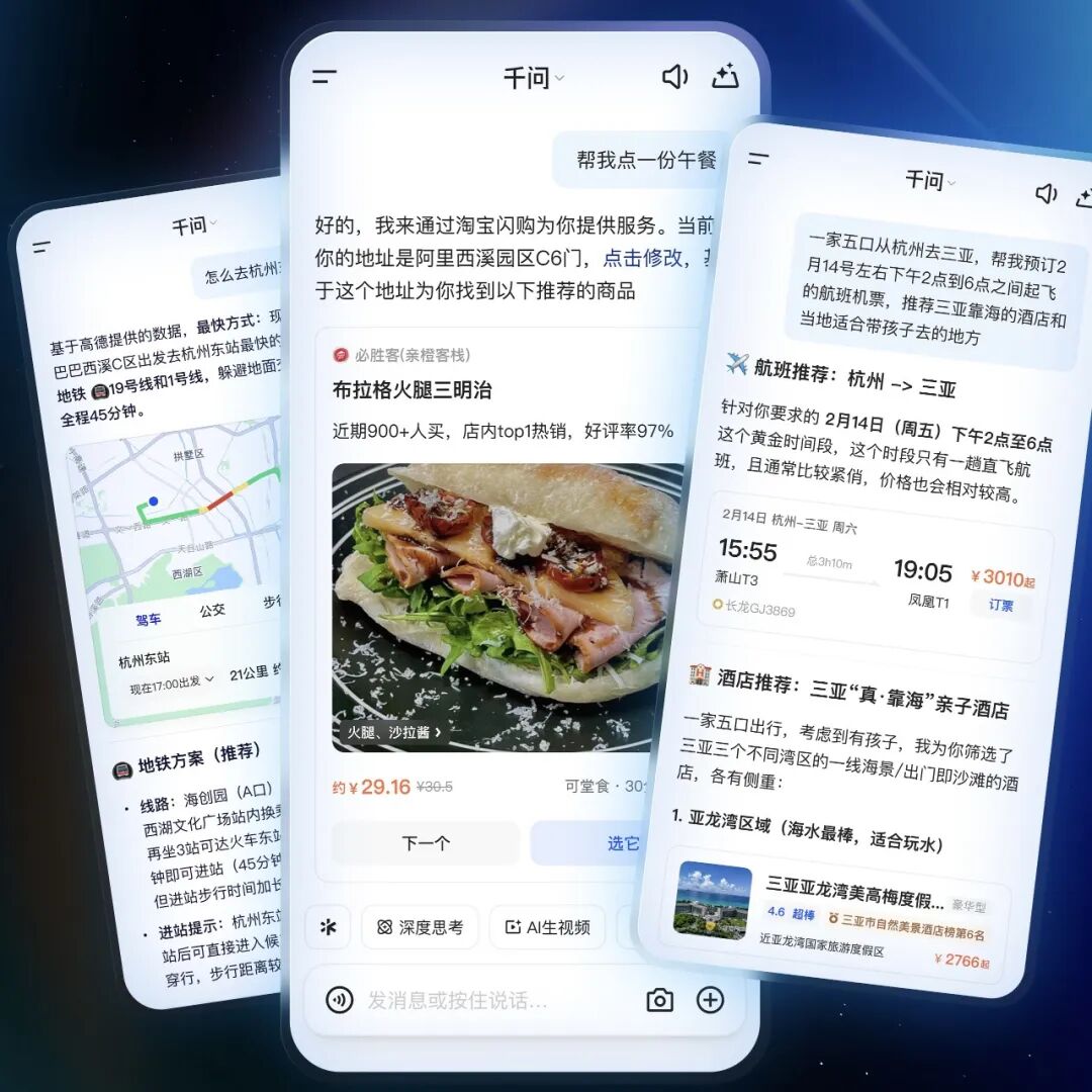 中国的AI则在“进入生活”,为用户提供便利。千问这样的应用,正在把模型能力嵌入外卖、出行、购物等日常场景。用户无需切换多个App,就能通过一句话完成一系列复杂操作。