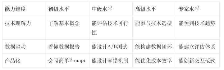 - AI思维能力(最高优先级):判断AI价值、识别机会、理解边界