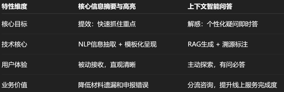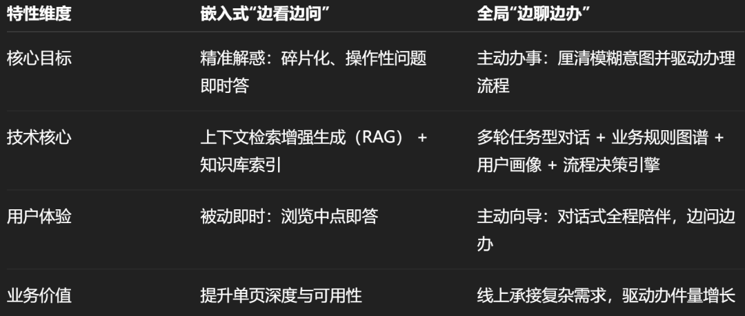 这两个场景共同构成“智能问答”的立体化服务网络:场景一(边看边问)解决特定场景下的深度解惑问题,场景二(边聊边办)解决全局模糊需求的引导与办理问题。