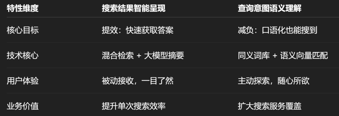 总结,这两个场景在技术上共用底层能力(如语义向量模型),在体验上形成闭环。场景一(结果呈现) 则确保了用户“看得懂、办得快”,场景二(意图理解) 确保了用户“搜得对”。