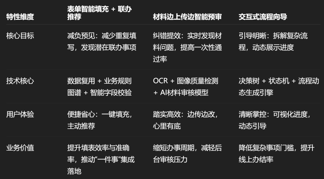 这三个场景共同构成了“智能办”的完整服务链:从准备阶段(场景一填表推荐)、到提交阶段(场景二材料预审)、再到执行阶段(场景三流程引导),层层递进,确保办事全程顺畅。