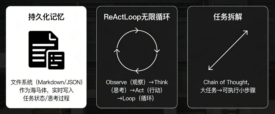 - 无限的“思考-行动”循环(ReActLoop) :它不是生成一段话就结束,而是运行在一个 While True 循环里:Observe(观察)→Think(思考)→Act(行动)→Loop(循环)。