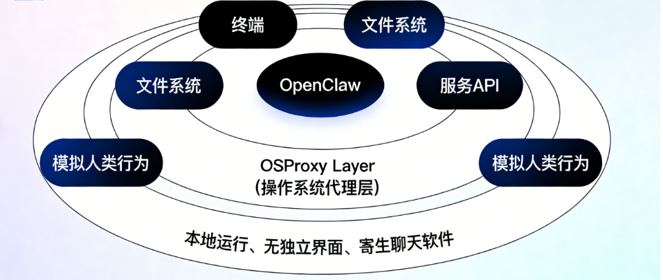 从系统架构上看,OpenClaw 更像是一个操作系统的代理层(OSProxy Layer) 。它的角色不是“帮你用 App”,而是: