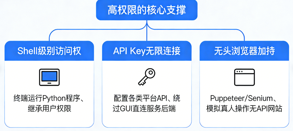 - API Key 的“无限”连接:一旦用户把 GitHub、Notion、Gmail 甚至券商交易接口的 APIKey 配置给它,它就能直接和服务后端对话,绕过图形界面(GUI),直接通过后门(API)与这些服务通信。