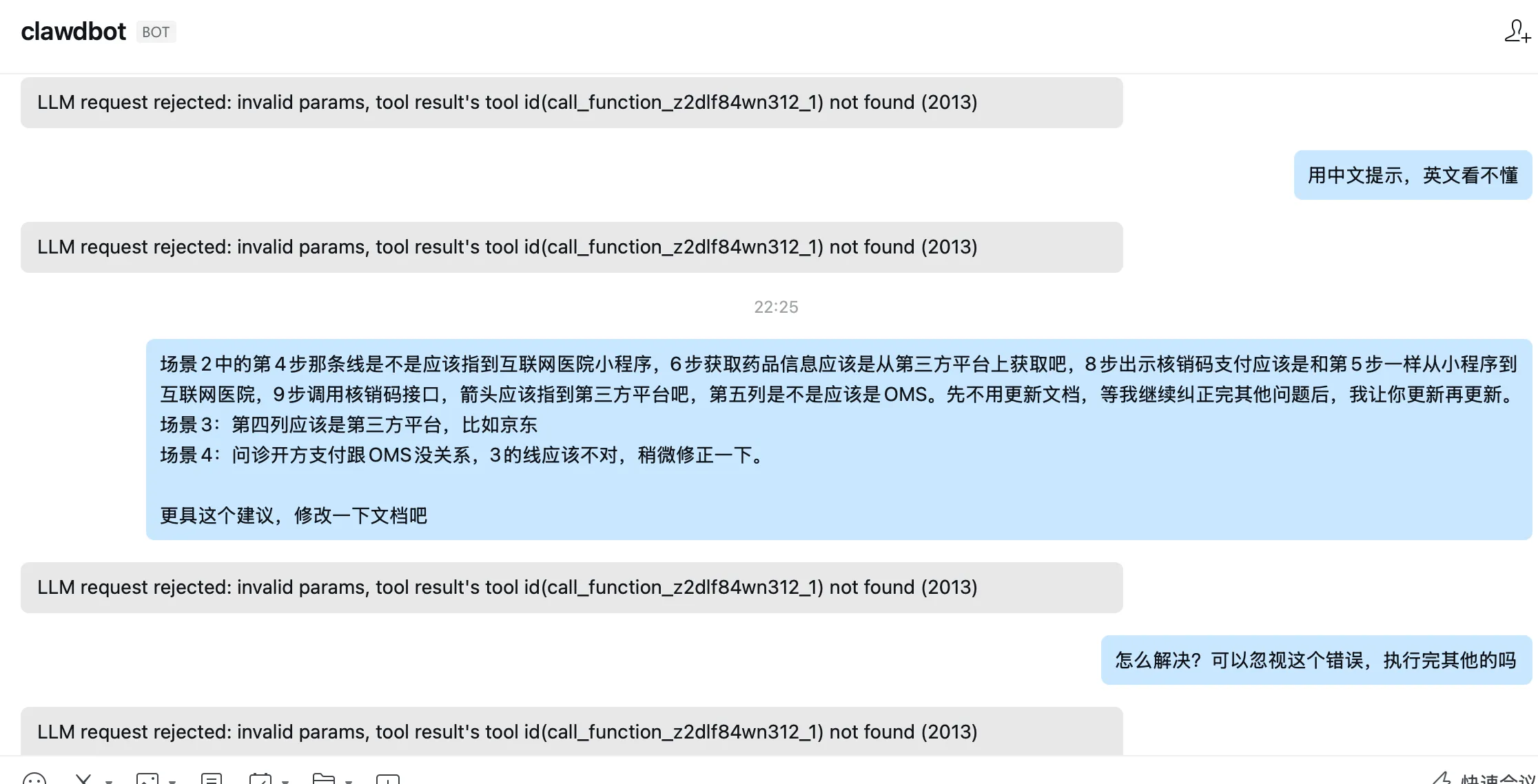 “LLM request rejected: invalid params, tool result’s tool id(call_function_z2dlf84wn312_1) not found (2013)”。