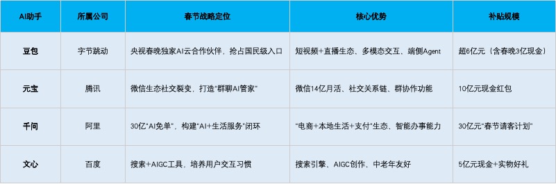春节档期始终是互联网产品抢占流量入口、用户心智的核心战场,2026年这一战场的核心主角变成了AI助手。字节豆包、腾讯元宝、阿里千问、百度文心四大产品均紧扣各自大厂的核心生态优势制定春节营销战略,投入高额营销补贴资源,试图在AI入口争夺战中建立先发优势。各家的战略定位、核心产品优势与补贴规模,对比如下: