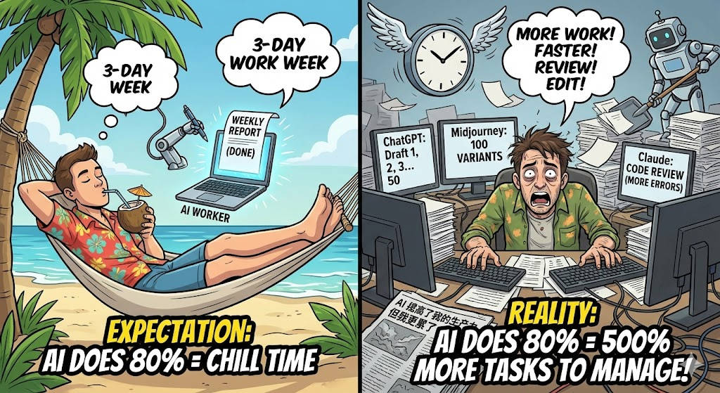 这听起来很反直觉。ChatGPT、Claude、Midjourney 明明帮我们秒生成了周报、代码和配图,理论上我们应该每周只工作 3 天,剩下时间在夏威夷喝椰汁才对。