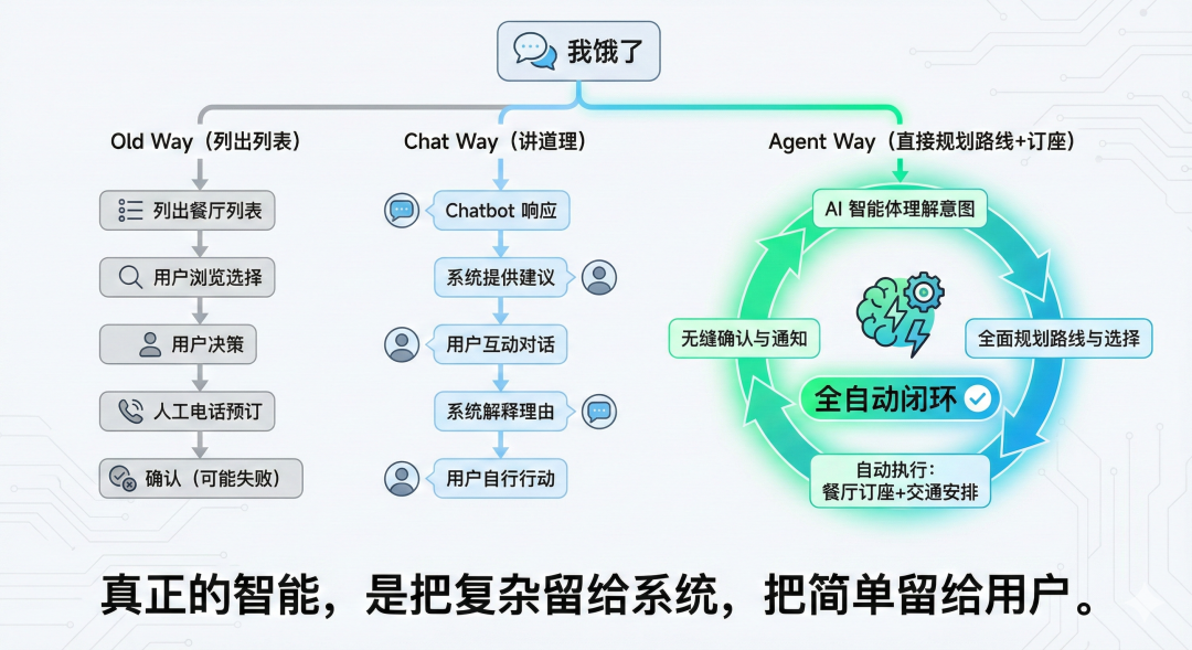 以前,你要完成“订座”这个动作,必须打开“大众点评”这个 APP。 现在,Agent 把“大众点评”拆解成了 API 接口。