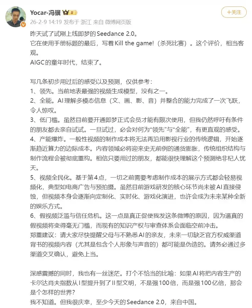 单就Seedance 2.0带来的影响来说,冯骥断言内容行业将迎来“史无前例的通货膨胀”,恐怕不是夸张。
