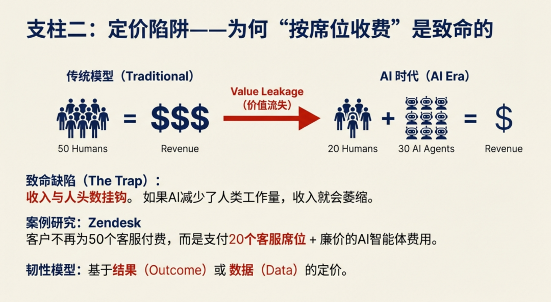 以按人头计费(席位制)的软件为例。在过去几十年中,这种模式几乎就是 SaaS 成功的代名词。企业将许可证卖给具体的员工,每一个席位都对应一个职能岗位,营收规模则直接取决于客户的员工人数。在那个由人类主导工作、软件仅提供辅助的时代,这套商业逻辑运作得天衣无缝。