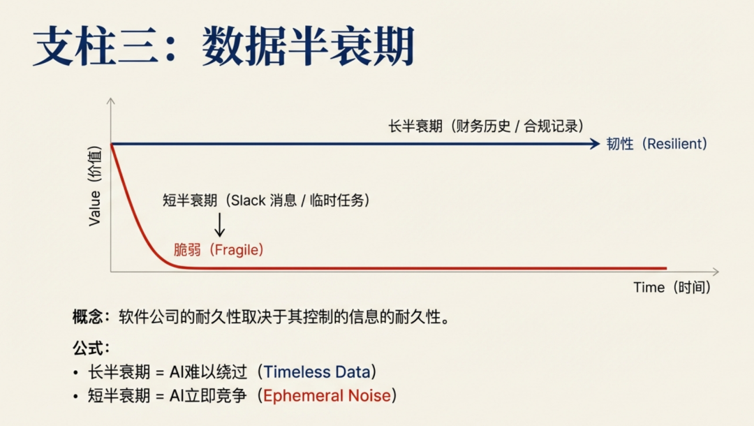 正是这种差异,解释了为什么某些软件公司即便技术架构显得陈旧,在变局面前依然稳如泰山,而另一些公司虽然产品时尚且用户活跃度极高,却始终笼罩在危机感中。衡量风险的核心变量并不在于创新的快慢,真正的关键在于系统中所积淀数据的“半衰期”长短。