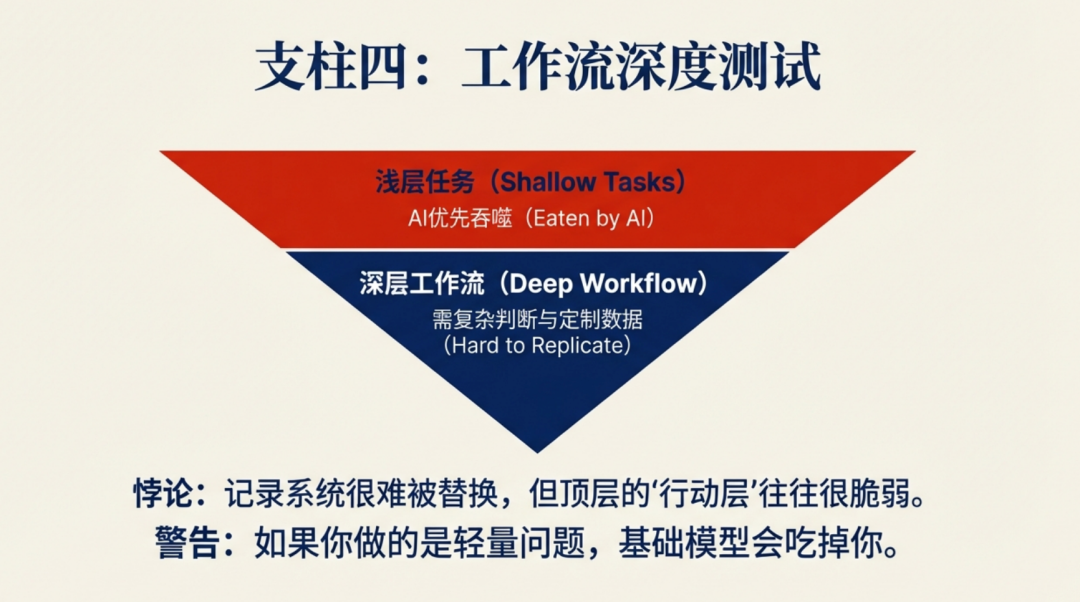 因此,对于投资者而言,工作流深度测试是对“记录系统”分析的有力补充,而非替代。核心问题不再仅仅是这家公司是否拥有关键数据,而是它所攫取的价值,是否与其围绕数据构建的执行逻辑达到了血肉相连、不可分割的程度。