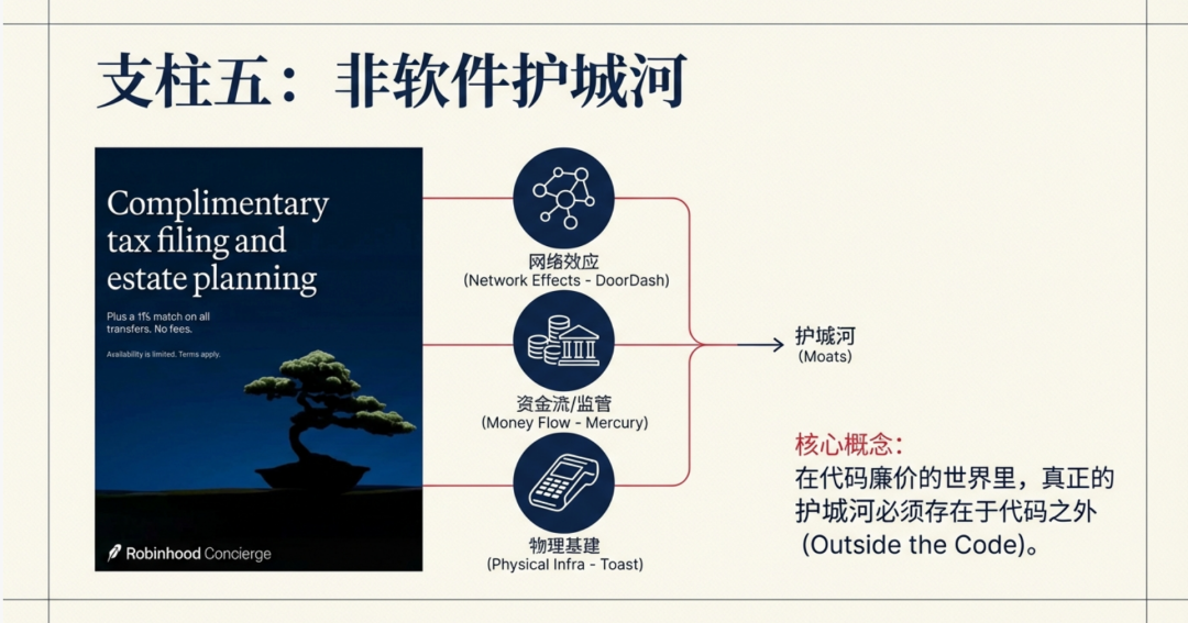 但如果 AI 降低了软件的开发门槛,并让功能的复制变得易如反掌,那么生命力最强的公司,将日益趋向于那些护城河延伸至软件之外的企业。