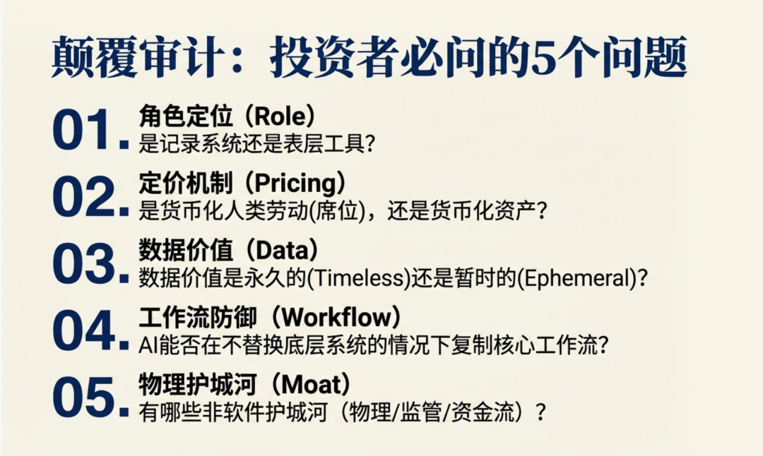 拆开来看,这些观点直观易懂;但合而为一,它们构成了一套极具杀伤力的评估工具,能帮我们洞察在 AI 智能体时代,一家软件公司究竟是稳如泰山,还是金玉其外。