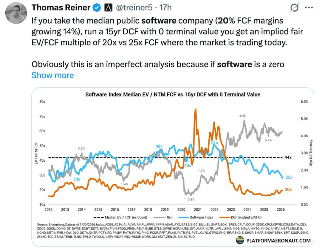 所以,我再次强调,目前的抛售在我看来并非完全失去理智——尤其是考虑到此前某些软件股那高高在上的估值。