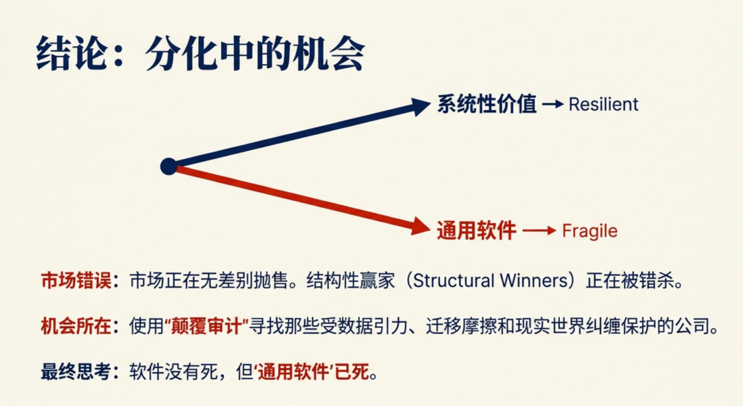 软件股并非一个同质化的资产类别,有些公司之所以更脆弱,并不是因为管理不善,而是因为它们的价值恰好位于那些极易被 AI 拆解的层级;而另一些公司则表现出更强的生命力,这并非因为它们对技术变革免疫,而是因为它们的优势深深植根于 AI 难以轻易复刻的资产之中。