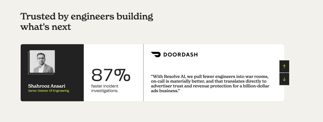 这个矛盾正是Resolve AI要解决的核心问题。这家成立仅16个月的公司刚刚完成了1.25亿美元的A轮融资,估值达到10亿美元。由Lightspeed Venture Partners领投,Greylock Partners、Unusual Ventures、Artisanal Ventures和A*等早期投资者全部超额跟投。更值得关注的是,他们已经拿下了Coinbase、DoorDash、MongoDB、Salesforce、Zscaler等重量级客户。这些公司每分钟的停机都意味着巨额损失,而Resolve AI帮助Coinbase将关键事故的调查时间减少了72%,帮助Zscaler将每次事故所需的工程师数量减少了30%。这不是小打小闹的优化,而是生产环境运维方式的根本性改变。我认为,他们正在定义一个全新的品类:AI for prod,也就是用AI来运行和维护生产环境中的软件。