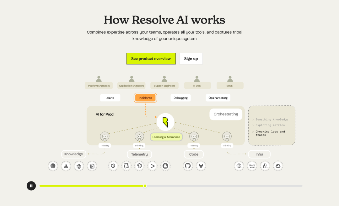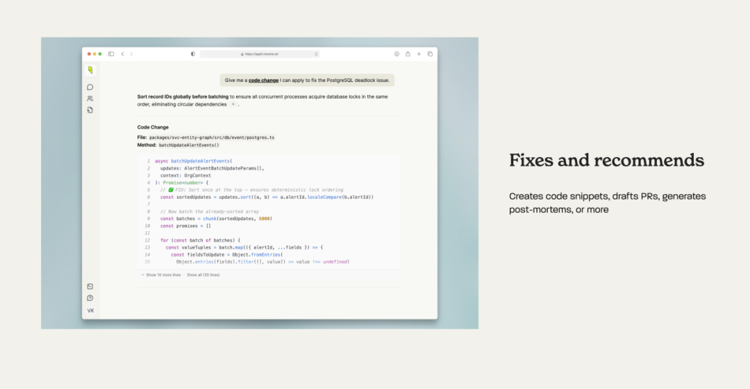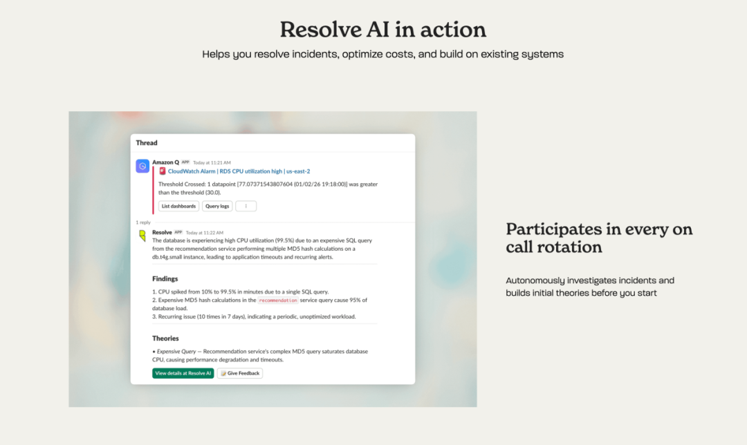 所以现在的情况是:AI让我们能够更快地生成代码,但如果我们不能同样快速地运行和维护这些代码,整体的技术迭代速度并不会真正提升。你可能在开发阶段快了5倍,但如果在运维阶段慢了3倍,整体效率的提升就大打折扣了。更不用说,生产环境的不稳定会直接影响用户体验、业务收入和公司声誉。这就是为什么我认为Resolve AI瞄准的是一个被严重低估但极其关键的问题。
