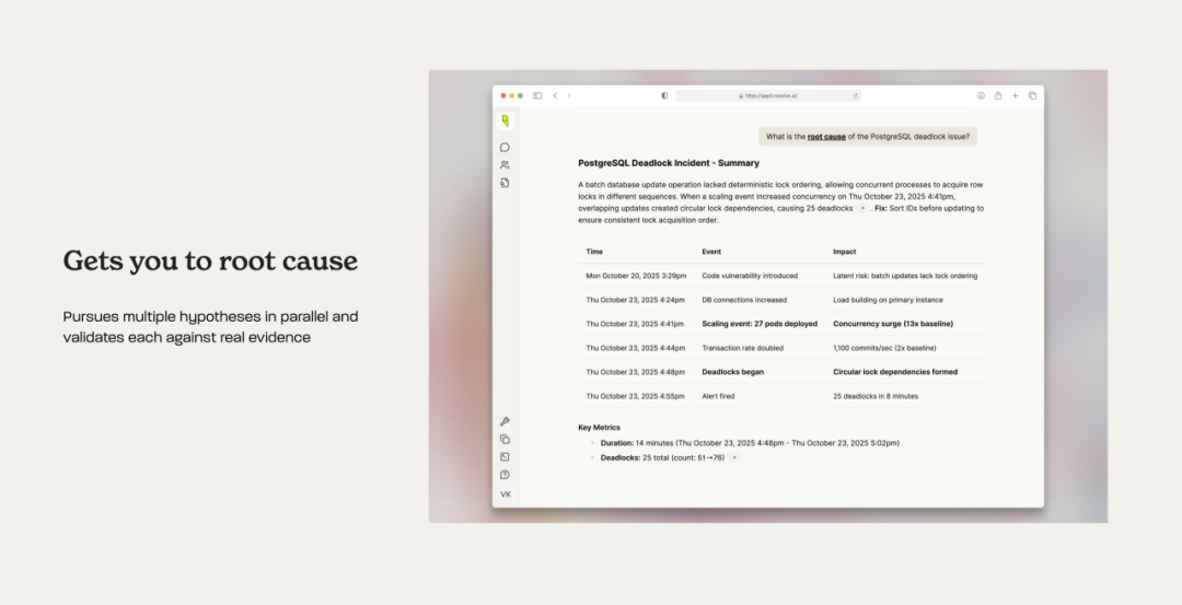 最重要的是,Resolve AI不只是给出一个答案,而是提供一个带有引用和推理过程的结构化解释。它会展示推理步骤、相关查询、甚至指出是哪个具体的Pull Request引入了问题。这种透明度对于建立工程师的信任至关重要。工程师可以验证AI的推理是否正确,理解它为什么得出这个结论,而不是盲目接受一个黑盒的建议。