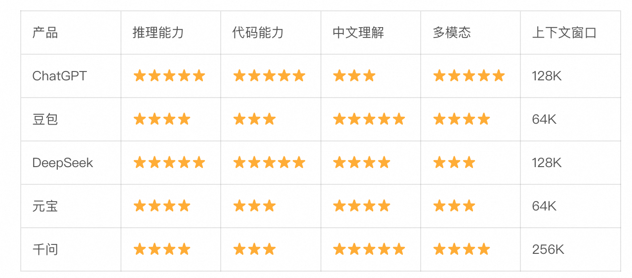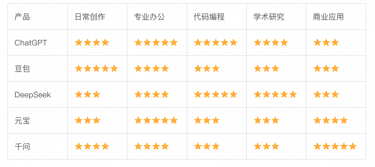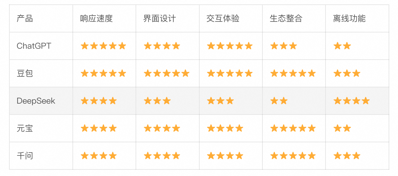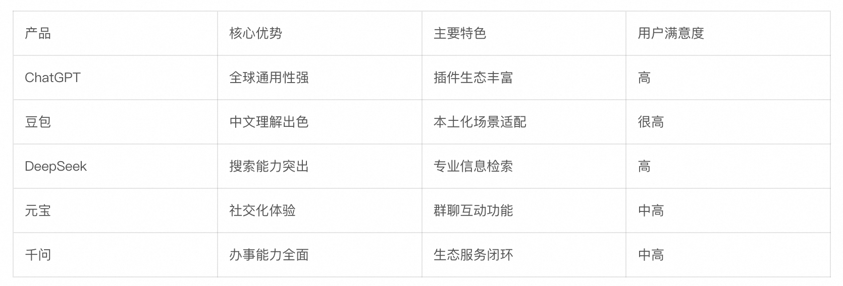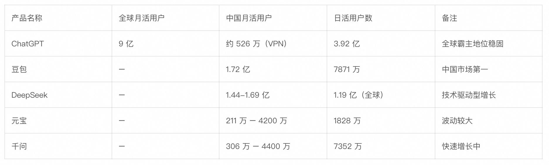 从全球市场来看,ChatGPT 依然占据主导地位,但中国市场已经形成了独特的竞争格局。豆包凭借字节生态的流量优势和产品体验的持续优化,已经成为中国市场的领导者;DeepSeek 以技术实力证明了 “技术即最好的广告”;元宝和千问则依托各自的生态优势,在特定领域建立了竞争壁垒。