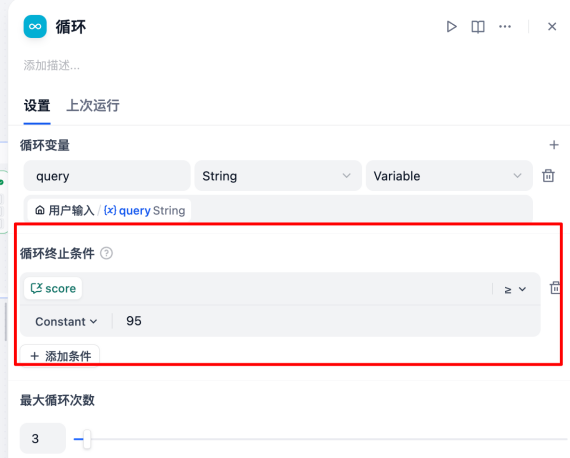 实测发现:在设置循环退出条件时,我尝试使用“布尔值(True/False)”,但也许是由于我还没找对配置姿势,循环节点始终无法支持boolean变量的True/false判断逻辑。最后,为了稳妥起见,我还是改为了使用数字判定,如定义一个number类型的score,判断score >= 95。这个也和Dify本身的一些组件特性有关。