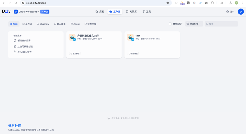 我们可以通过Dify云https://dify.ai/快速注册并免费使用(推荐新手使用这个方式),也可以考虑通过Docker安装(适合有一定技术基础的老手),下图即为我注册成功后的dify页面。