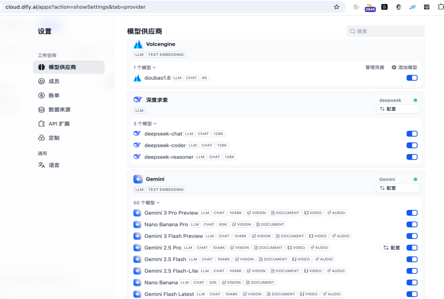 注册好Dify 后,我们要给它装上“大脑”。这步其实非常简单,只需要在[设置] -> [模型供应商]里绑定你的API Key。无论你用的是DeepSeek、Gemini(谷歌),还是通过硅基流动/火山引擎接入,只要看到图标变成绿色状态(见下图),点击显示模型可以看到对应的大模型,就说明AI 已经准备好为你打工了!为了方便演示,阿康也是充值了多个平台的API了。