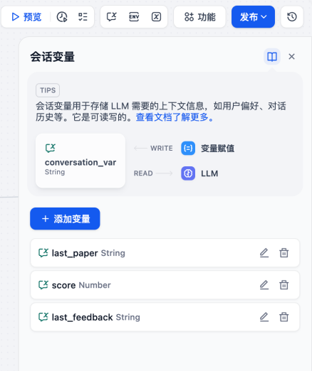 实测发现:在实现数据交互时,如果仅仅依赖节点间的连线,也许会导致每一轮产生的结果参数无法被有效继承。建议:一定要使用“会话变量(Conversation Variables)”来保存每步产生的结果参数。这就像是给Agent 安装了一个稳定的寄存器,能有效避免数据在流转中丢失。如果没有这一步,AI很难记不住上一轮改了什么。