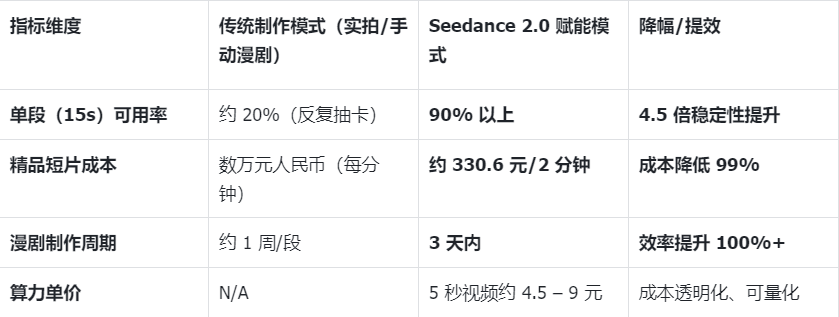 在“人人都是产品经理”的圈子里,不谈业务价值的技术都是耍流氓。Seedance 2.0 最具冲击力的是它对内容生产经济模型的重构。