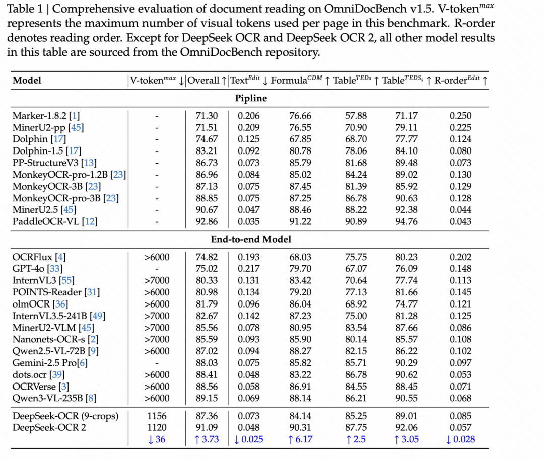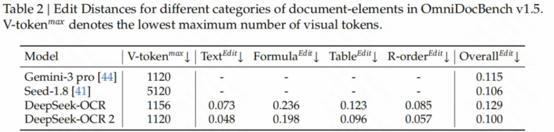 更妙的是,DeepSeek-OCR 2 在保持高精度的同时,视觉 token 数量控制在 256 到 1120 之间,和 Google 的 Gemini-3 Pro 相当,但远低于 MinerU2.0(6000+ token)。这意味着什么?意味着用更少的资源,实现了更好的性能。