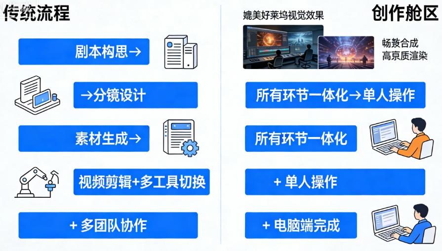 这就是传统AI短剧制作的真实写照——繁琐、低效,充满不确定性。创作者的大部分精力都消耗在技术实现和流程管控上,真正用于创意本身的时间反而不多。