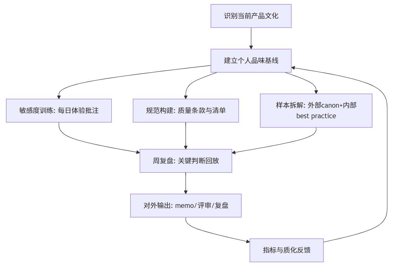 作为AI产品经理,想训练自己的品味不妨尝试我这套框架,敏感度训练 → 规范构建 → 公司文化自测。它的核心目标在于让“你更稳定地做出同类好判断”。