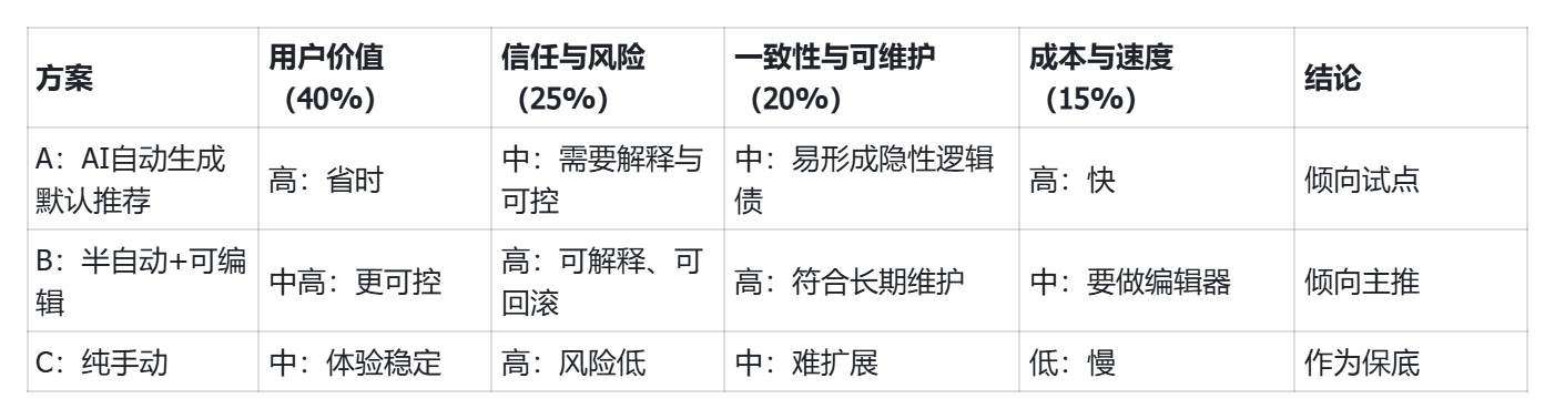 可以尝试使用这个决策对比矩阵,目的是把“主观偏好”拉回“质量条款”,同时把AI生成的选项纳入同一把尺。