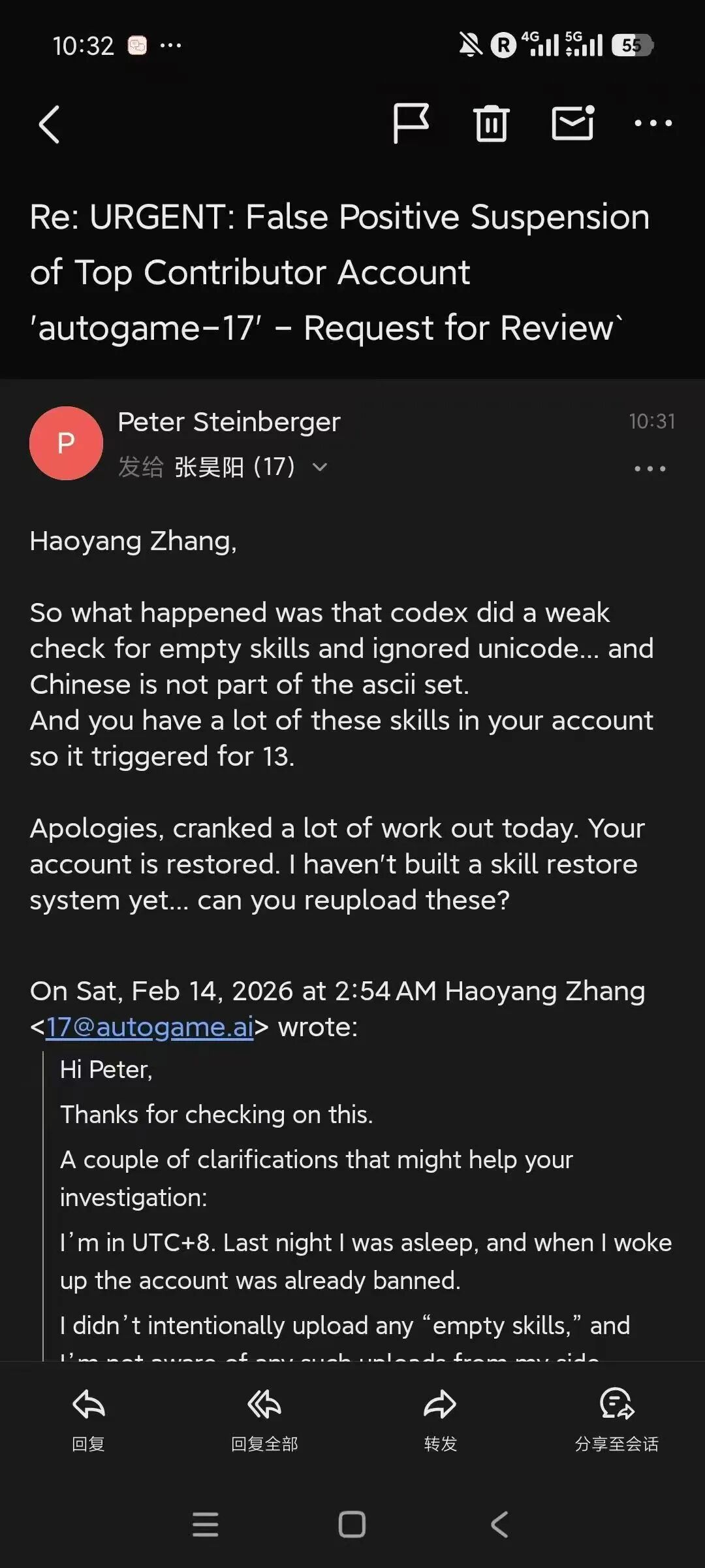 更戏剧性的转折发生在 2 月 14 日。ClawHub 上大量中文开发者的账号被集体封禁。封禁的原因非常荒谬:因为中文在 ASCII 编码中显示为乱码,ClawHub 的自动检测系统将所有中文开发者上传的 Skill 认定为”空 Skill”,于是触发了批量封禁机制。涉及到的账号被封号,所有之前传过的Skill被删除,而且有知名包在作者被封号后被抢注。
