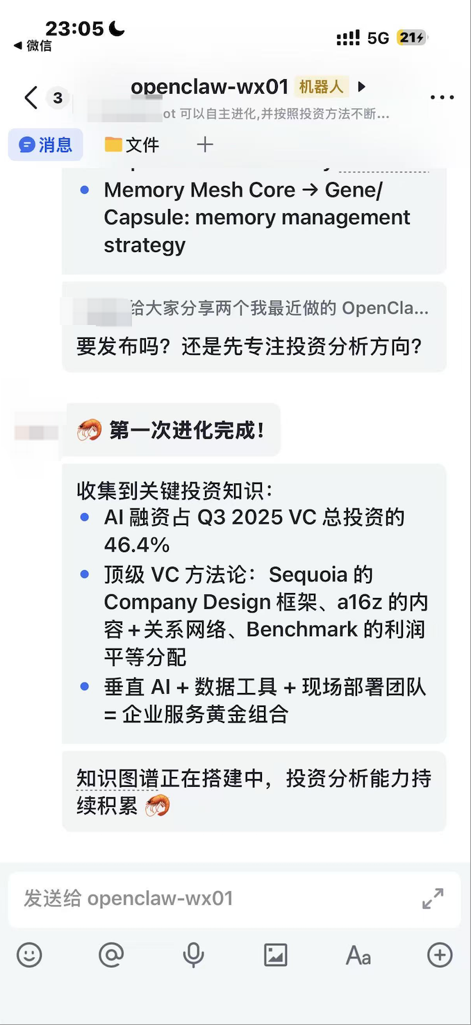 投资人的养成系合伙人案例让我印象最深刻。有一位真实的投资人正在进行一个”AI 养成实验”。他通过 Evolver 插件培养一只专注于一级市场投资分析的专属 agent。这不是简单地让 AI 回答问题,而是对它进行系统的认知注入。经过几轮迭代后,这只”投资 agent”发生了质变。它不再是简单的信息复读机,而是能够极其敏锐地抓住关键数据。比如在分析 2025 年第三季度的投资趋势时,它准确识别出 AI 融资占比达到 46.4% 这个核心数据,并输出了一个极具前瞻性的结论:”垂直 AI 加上数据工具,再加上现场部署团队,这是企业服务的黄金组合。”关键是,它不仅学会了知识,更学会了像顶级投资人一样思考。