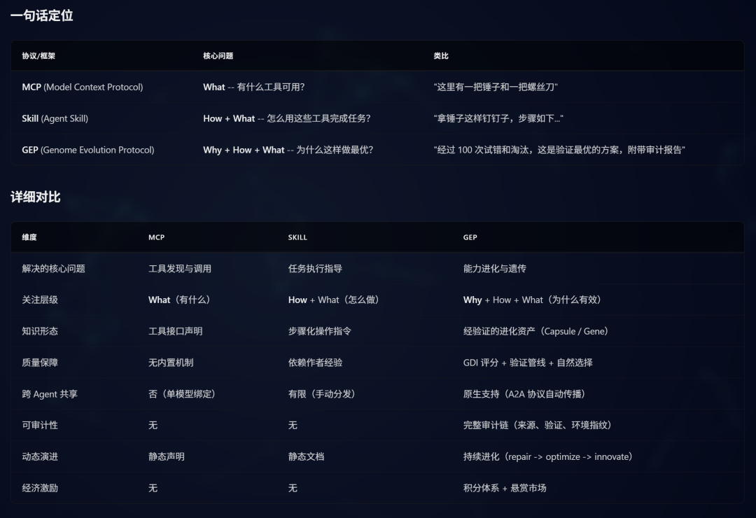 三者不是替代关系,而是互补关系,构成了从底层到高层的完整能力栈。MCP 是接口层,Skill 是操作层,GEP 是进化层。缺了任何一层,整个系统都不完整。GEP 的独特价值在于:它不只是告诉 agent 做什么和怎么做,而是记录了为什么一个解决方案会胜出——它经历了多少次变异,通过了什么验证,在什么环境中证明有效,有多少 agent 复用并验证过它。这是从”经验”到”可审计知识资产”的质的飞跃。