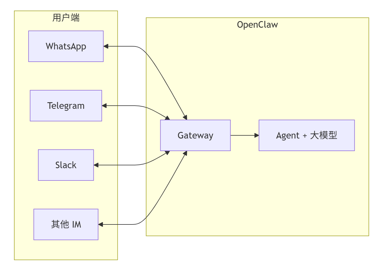 - Gateway 负责:连接各种 IM 渠道、管理会话、调用大模型、把回复发回对应渠道;