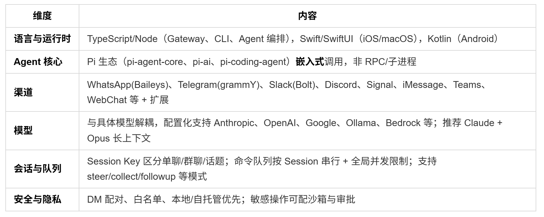 - 大模型 由 Gateway 内的 Agent 通过 Pi 等抽象统一调用,支持多 Provider、多模型、OAuth/API Key。