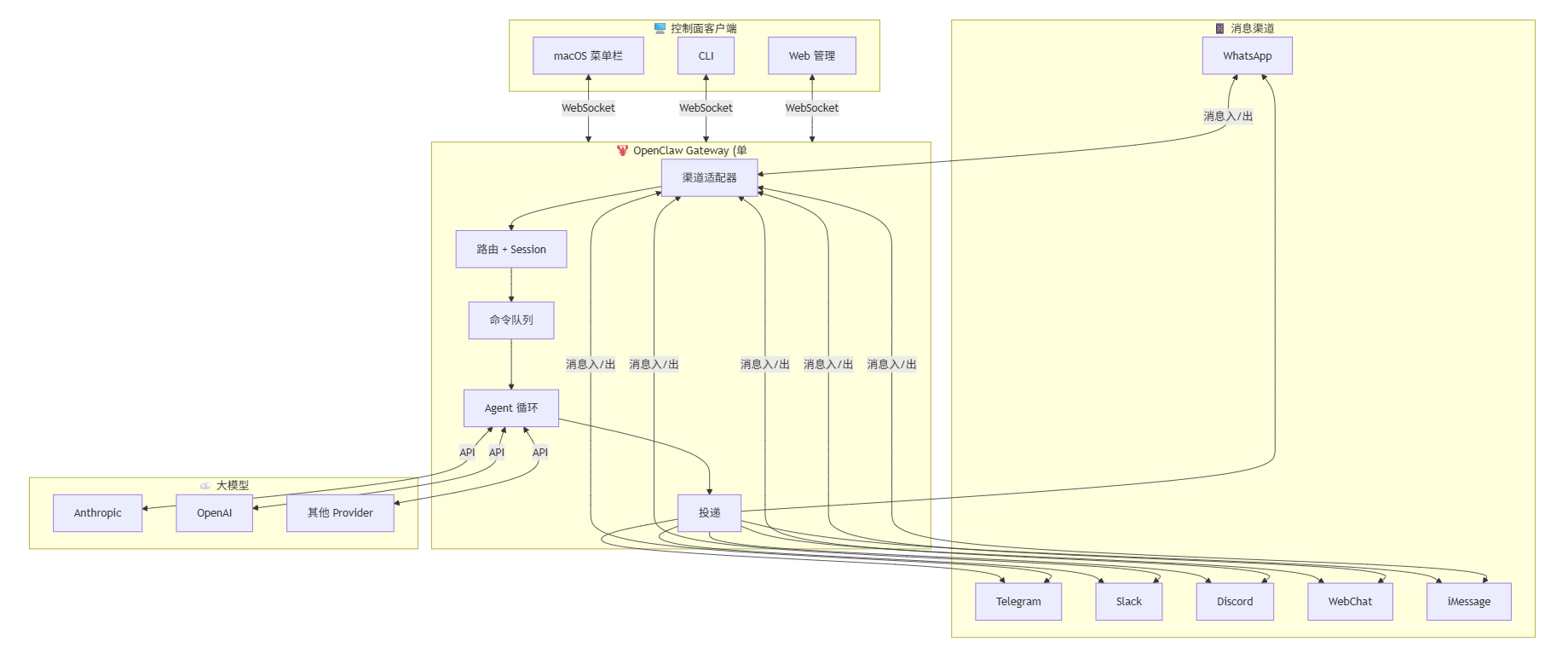 - 控制端(macOS 应用、CLI、Web) 通过 WebSocket 和 Gateway 通信,不直接连 IM。