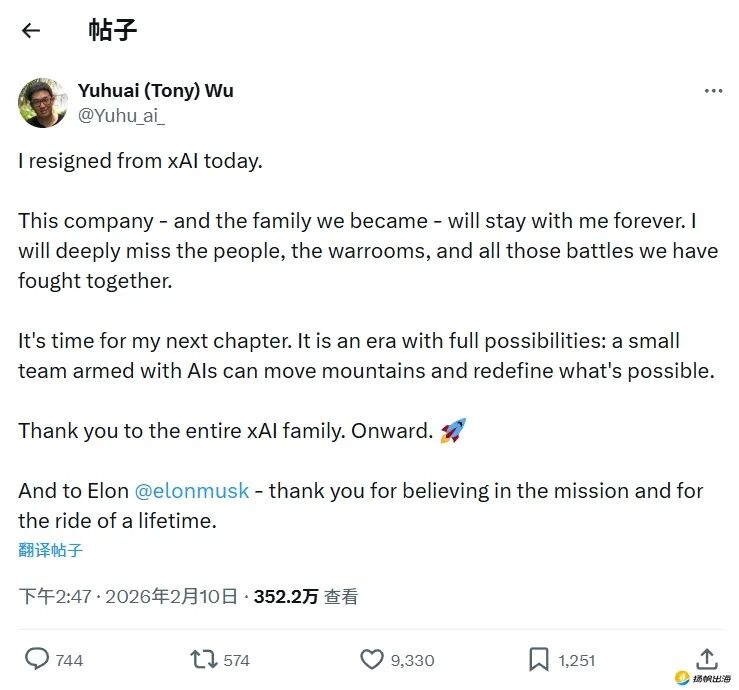 2026年2月10日至11日,两位联合创始人吴宇怀(Yuhuai Tony Wu)与Jimmy Ba相继宣布离职。对此,吴宇怀在X上写道:“我的人生即将开启新的篇章。这是一个充满无限可能的时代:一支配备人工智能的小团队可以移山填海,重新定义一切皆有可能。”